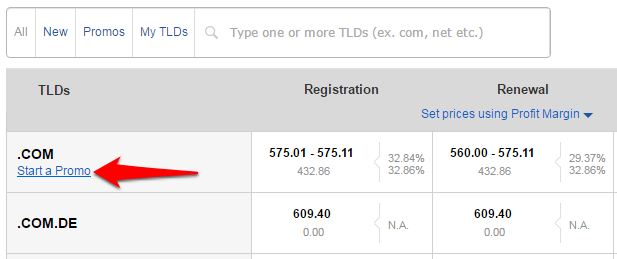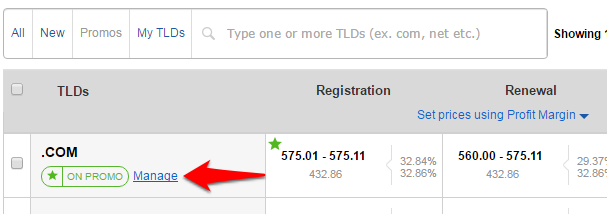 • A green star indicates that a Promo is activated for a TLD for Registration, Renewal and/or Transfer.