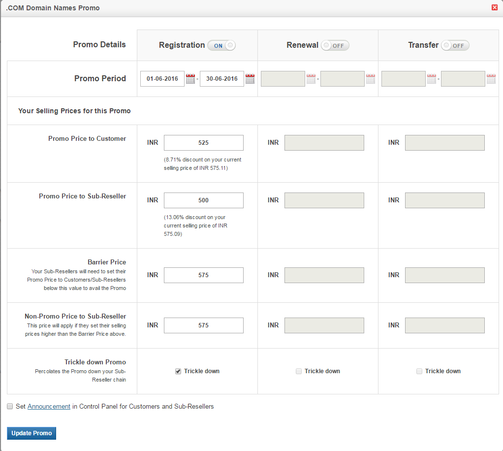 • Set Announcement under Control Panel for Customers and Sub-Resellers: Selecting this checkbox would add an Announcement in your Customers and Sub-Resellers Control Panel with details about this promotion.