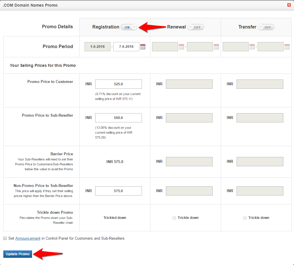 • You may modify the Promo Price to Customer, Promo Price to Sub-Reseller and Non-Promo Price to Sub-Reseller at any time.