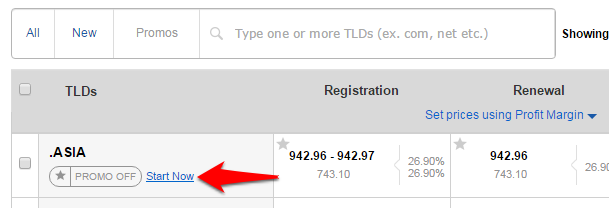 Click on the Promos link to list the TLDs with available promos.