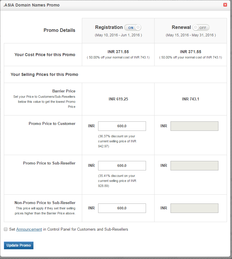 You may modify the Promo Price to Customer, Promo Price to Sub-Reseller and Non-Promo Price to Sub-Reseller at any time.